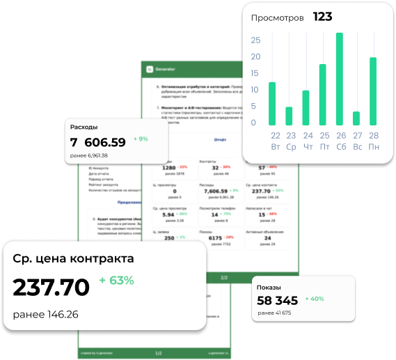 U-Generator — идеальный инструмент для тех, кто работает с Авито и хочет тратить меньше времени на отчёты и больше на реальную работу с клиентами. Сервис подойдёт всем, кто занимается продвижением товаров и услуг, ведёт рекламу на Авито или управляет объявлениями.